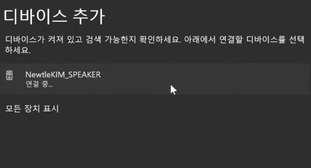 업로드가 완료되면 위와 같이 블루투스 디바이스 추가에서 스피커가 잡히는 것을 볼 수 있다.