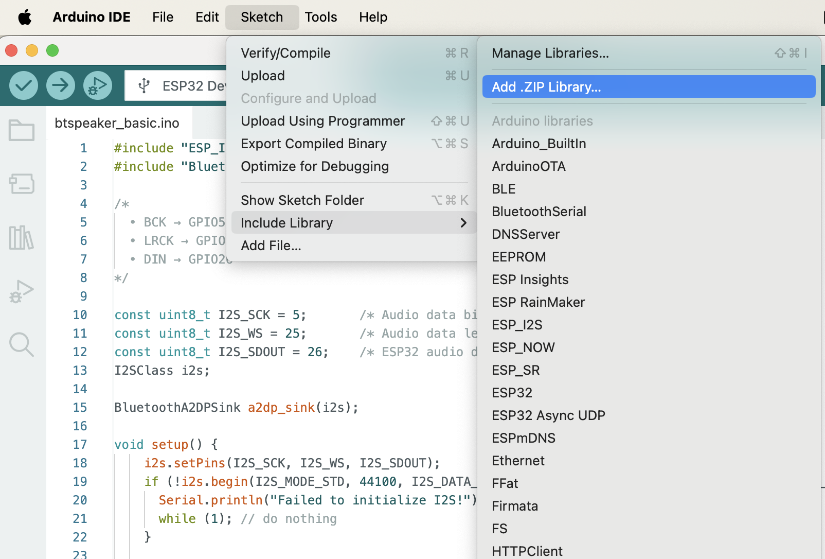 아두이노IDE 에서 Sketch - Include Library - Add .ZIP Library 에서 ESP32-A2DP 라이브러리를 추가한다.