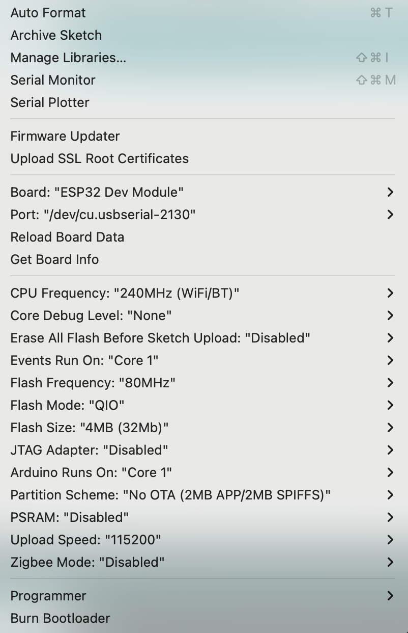 이대로 컴파일을 하면된다. ESP-WROOM-32 사용할 때는 Tools 에서 아래와 같은 설정으로 업로드하였다.